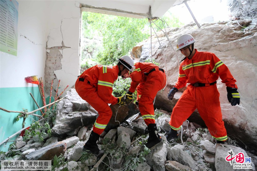 4月21日,在广西柳州市融安县浮石镇六寮小学,消防官兵在清理受灾现场。中国网图片库 作者:谭凯兴