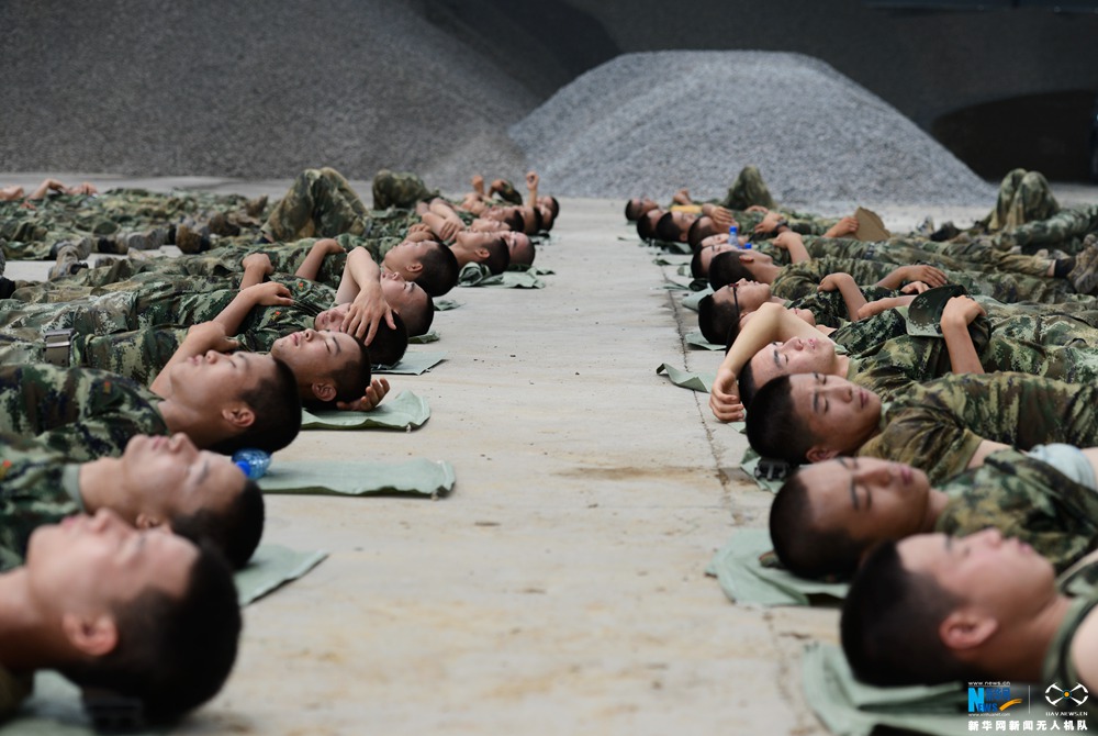 疲惫的武警战士们席地而睡。 新华网 欧阳小洁摄