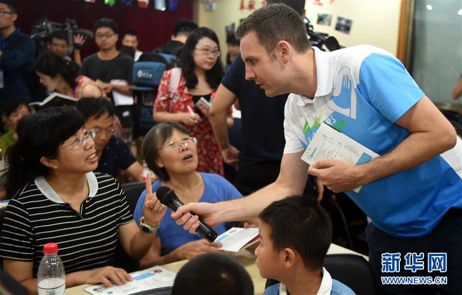 浙江大学留学生、来自澳大利亚的志愿者提姆在杭州东山弄社区教居民学英语(新华社记者 王定昶 8月2日摄)