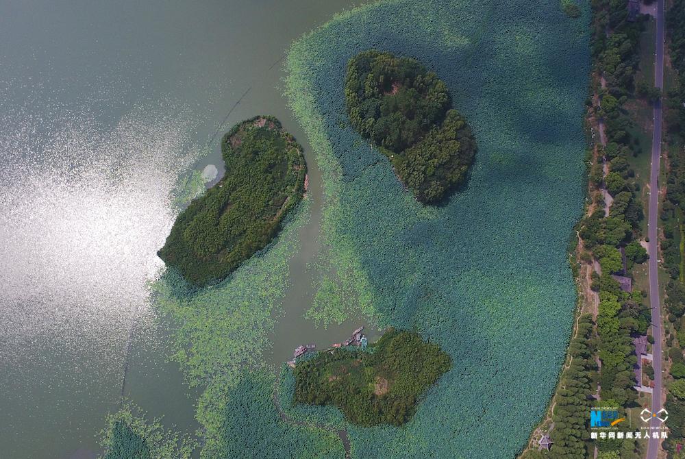 玄武湖在六朝时面积比现在要大到2倍左右,而且直接与长江相通,湖中可以成为水军训练场所。大约从东晋开始,玄武湖已经得到多次整治与建设。特别是南朝时期,皇朝在玄武湖中及周边大兴园林,区域内先后有过上林苑、华林苑、乐游苑等皇家园林。图为航拍湖中荷塘。新华网刘沛摄 飞手 孙帅