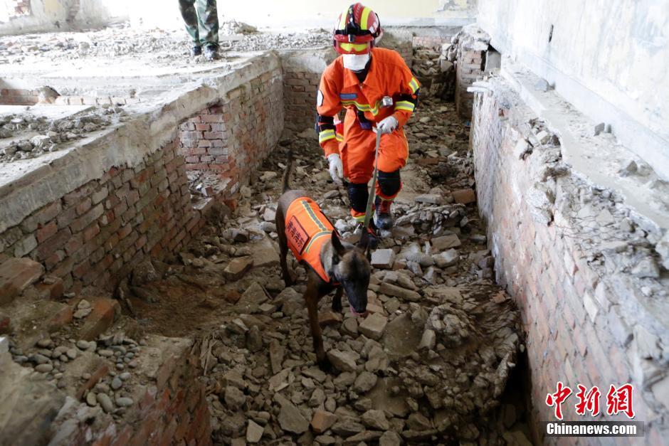 8月7日,中国首次高原环境下跨区域地震救援实战演练在青海省海北藏族自治州海晏县正式拉开帷幕。来自青海、甘肃、宁夏、陕西、新疆、西藏6个省区的400余名消防官兵参加了演练。图为消防官兵带着搜救犬进行生命迹象搜索演练。中新社记者 李慧思 摄