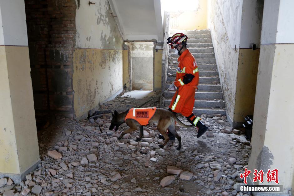 8月7日,中国首次高原环境下跨区域地震救援实战演练在青海省海北藏族自治州海晏县正式拉开帷幕。来自青海、甘肃、宁夏、陕西、新疆、西藏6个省区的400余名消防官兵参加了演练。图为消防官兵带着搜救犬进行生命迹象搜索演练。中新社记者 李慧思 摄