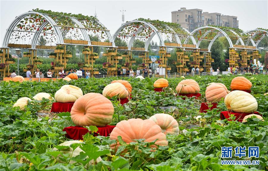 8月12日,参观者在第十五届长春农博会现场参观展出的巨型南瓜。
