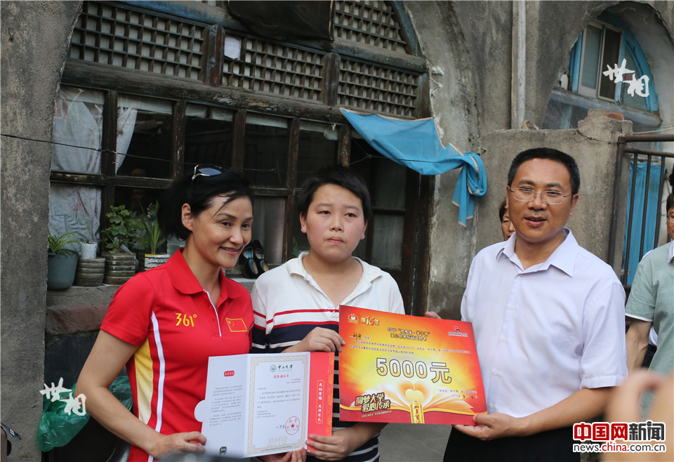 “加多宝学子情”爱心助学行动项目组的工作人员通过学校团委了解到刘宇的情况后,表示愿意资助他上学,并送去5000元助学金和装有入学生活必需品的“加多宝助学梦想行囊”,解决了刘宇一家的燃眉之急。图为加多宝集团党委书记庞振国和前奥运跳水冠军高敏与刘宇合影。