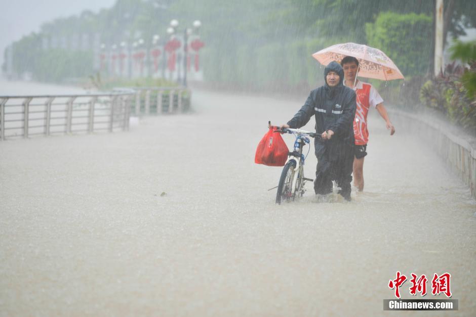 8月18日,2016年第8号台风“电母”给海南带来强暴雨天气,致海南省多市县出现严重内涝。在海南西部的临高县大部分道路积水严重,车辆无法通行,穿县城而过的文澜江滚滚洪水漫过江堤,低洼路段已被洪水吞没。图为海南省临高县市民冒险在洪水淹没的江堤行走。中新社记者 骆云飞 摄