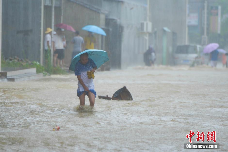 8月18日,2016年第8号台风“电母”给海南带来强暴雨天气,致海南省多市县出现严重内涝。在海南西部的临高县大部分道路积水严重,车辆无法通行,穿县城而过的文澜江滚滚洪水漫过江堤,低洼路段已被洪水吞没。图为海南省临高县文澜江洪水漫涨涌进江边街道,市民冒险在湍流的洪水中前行。中新社记者 骆云飞 摄