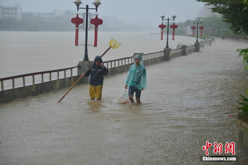 8月18日,2016年第8号台风“电母”给海南带来强暴雨天气,致海南省多市县出现严重内涝。在海南西部的临高县大部分道路积水严重,车辆无法通行,穿县城而过的文澜江滚滚洪水漫过江堤,低洼路段已被洪水吞没。图为海南省临高县市民冒险在洪水淹没的江堤行走。中新社记者 骆云飞 摄