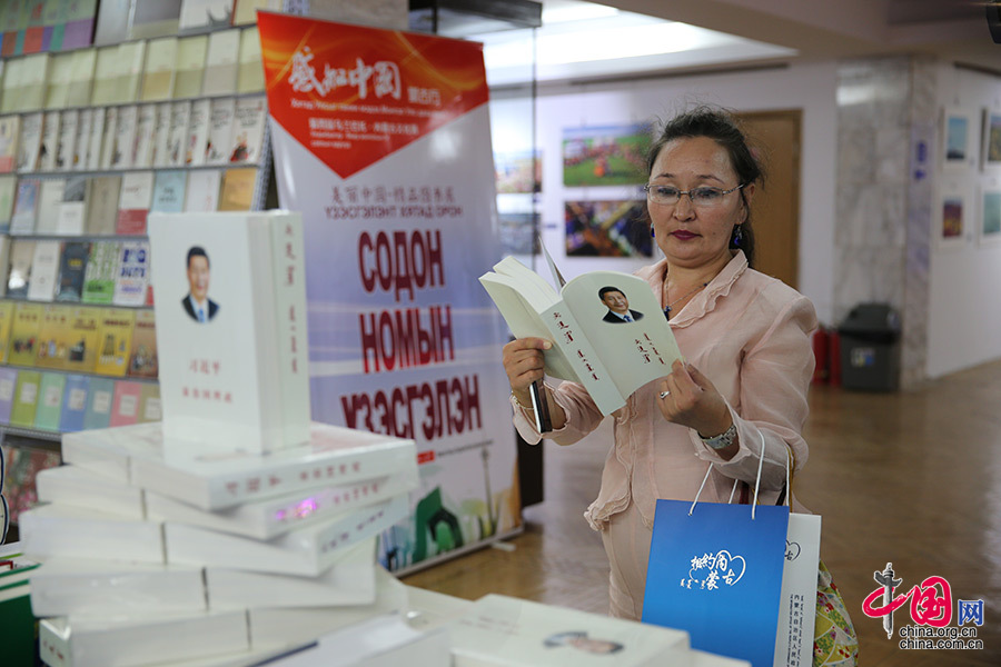 2016年8月18日,“感知中国·蒙古行——第四届乌兰巴托·内蒙古文化周”开幕式在蒙古国首都乌兰巴托市举行。这是蒙古国观众在“中国图书联展”展台前翻阅《习近平谈治国理政》(蒙古文版)。中国网郑文华 摄