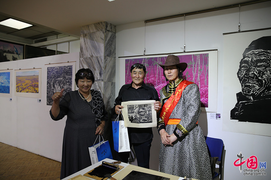 2016年8月18日,“感知中国·蒙古行——第四届乌兰巴托·内蒙古文化周”开幕式在蒙古国首都乌兰巴托市举行。这是内蒙古自治区非物质遗产扎鲁特版画传承人佟金峰将现场制作的版画赠送给蒙古国观众。中国网 郑文华 摄