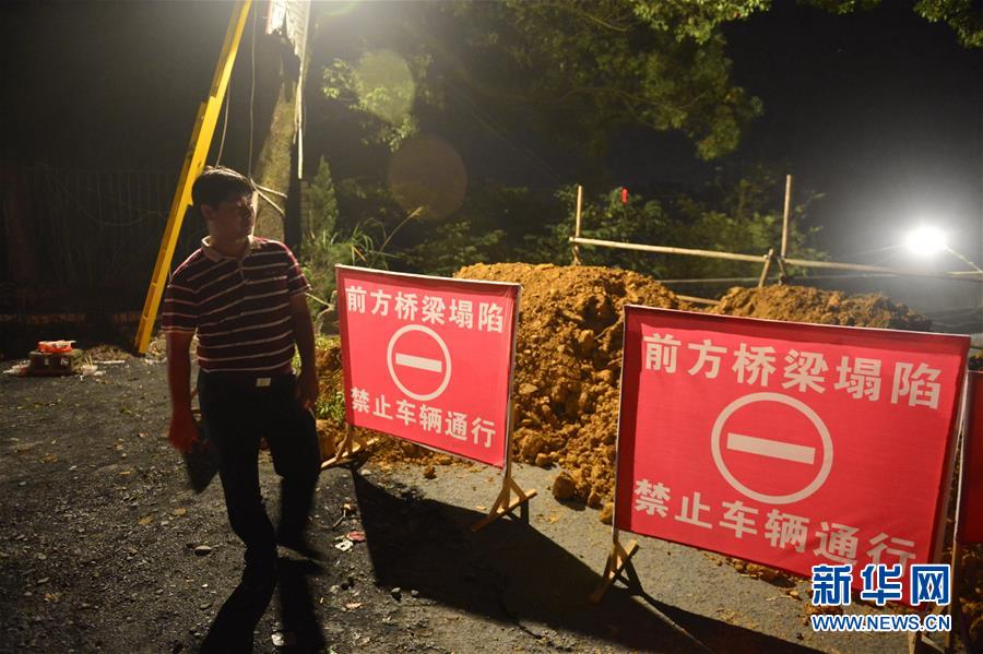 8月22日,事发地乡镇干部守在坍塌的姜家渡老桥桥头。 8月21日晚20时30分许,江西省九江市修水县姜家渡老桥发生坍塌,一辆电动车和一辆面包车坠桥。截至22日1时,事故已经造成3人死亡2人受伤。目前,事故具体原因还在进一步调查中。新华社记者周密摄