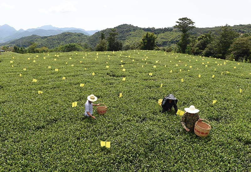 茶农在福鼎市磻溪镇十三坪大沁生态有机白茶园里劳作(8月25日摄)。