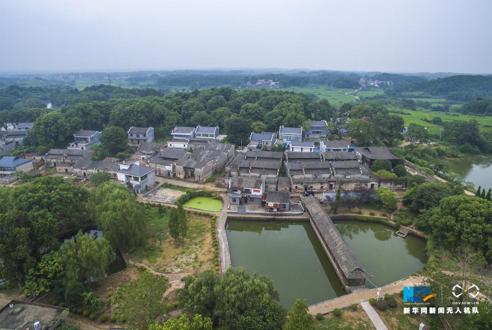钓源古村村口有七口水塘,水塘布局形成“七星伴月”之景。全村无论街、道、巷,无一取直,全然“歪门斜道”;建筑物的朝向,一反坐南朝北的惯例,囊括多种朝向,似太极八卦图,这也是村子独特的地方。图为村外古樟成林,稻田、水塘、青山交映。新华网杨益民摄