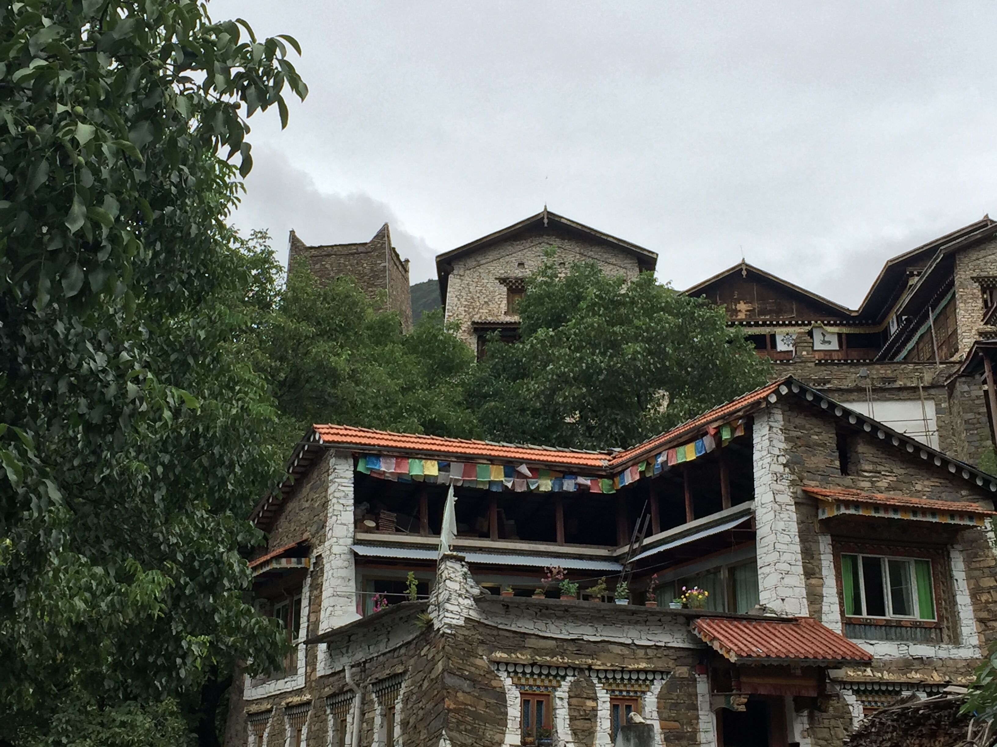 西索村依山而建,对面就是颇有气势的卓克基土司官寨。民居用形状不规则的石头垒建,一般三到四层,除房顶四角和窗户四周涂以白色装饰,门、窗沿漆有红蓝绿色的花纹外,墙壁石头裸露在外,颇有古朴粗犷之感。