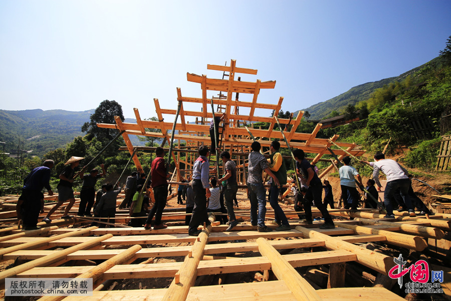 亲朋戚友参与竖屋上梁,送礼道贺,帮忙竖扇做工。 曾勇摄