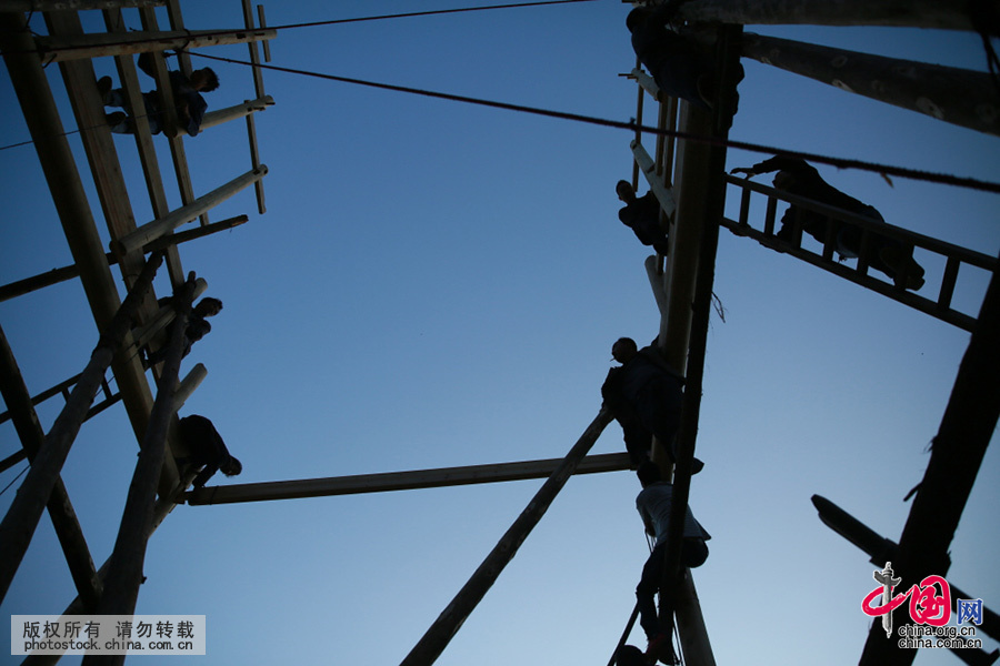 两排屋架子竖立后,工匠搭梯子登上屋架。 曾勇 摄