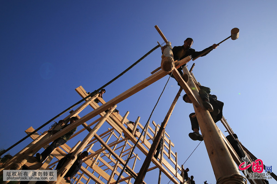 村民安装建筑物最高的一根中梁。 曾勇 摄
