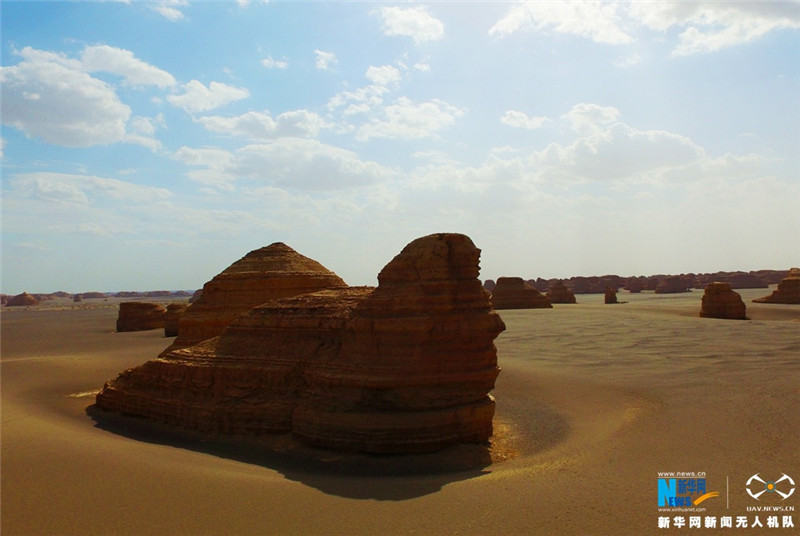 沿着古丝绸之路,循着声声驼铃,走进穷荒绝漠、风吹石头走的敦煌雅丹地貌群。茫茫旱海之中,造型各异的地貌景观,上万年来静沐朝霞夕辉,见证着丝路的繁华与荣光。新华网信江摄 飞手 王生元