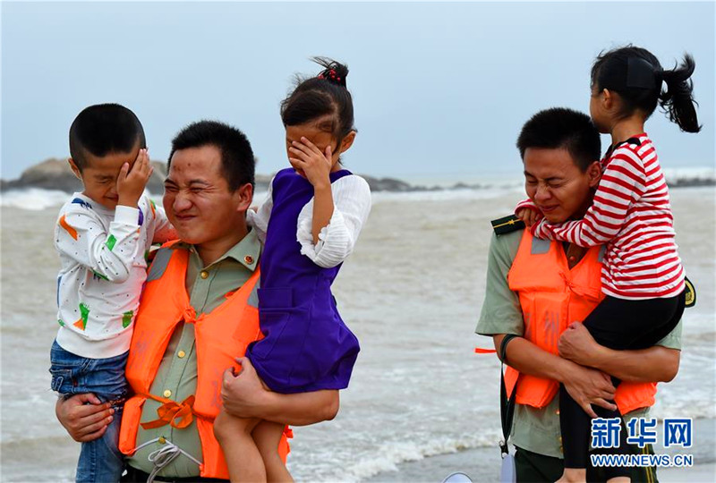 9月27日,福州市漳港边防派出所民警在南澳海滩带离在海滩玩耍的孩子。当日,福建省启动防台风Ⅱ级响应,有关部门提醒海边作业人员注意安全转移,做好渔船进港、电力设施防护、关闭沿海景区等工作。 9月27日12时,今年第17号台风“鲇鱼”中心位于距离厦门480公里的洋面,近中心最大风力15级(强台风级),并以每小时20公里左右的速度向西北偏西方向移动。预计将于28日凌晨到上午在福建惠安到漳浦沿海登陆。新华社记者张国俊摄