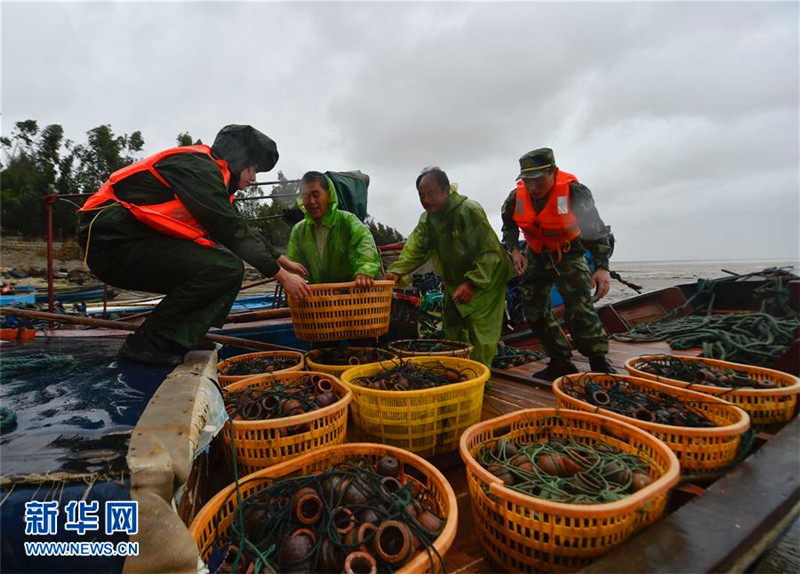 9月27日,福州边防支队官兵在福州福清市龙田镇东壁岛码头帮助渔民转移渔具。 新华社记者宋为伟摄