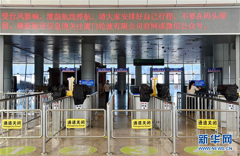 厦门国际邮轮中心厦鼓航线游客通道已经关闭(9月27日摄)。 9月27日,福建省启动防台风Ⅱ级响应,有关部门提醒海边作业人员注意安全转移,做好渔船进港、电力设施防护、关闭沿海景区等工作。 9月27日12时,今年第17号台风“鲇鱼”中心位于距离厦门480公里的洋面,近中心最大风力15级(强台风级),并以每小时20公里左右的速度向西北偏西方向移动。预计将于28日凌晨到上午在福建惠安到漳浦沿海登陆。新华社记者林善传摄