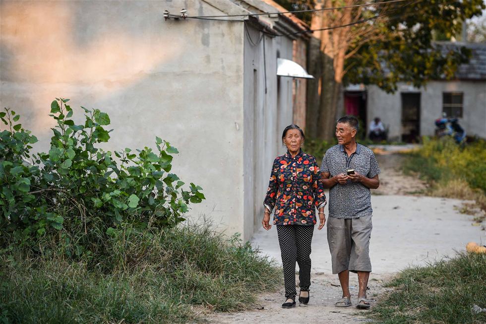 9月22日,罗会兵(右)和老伴走在去田间的道路上。