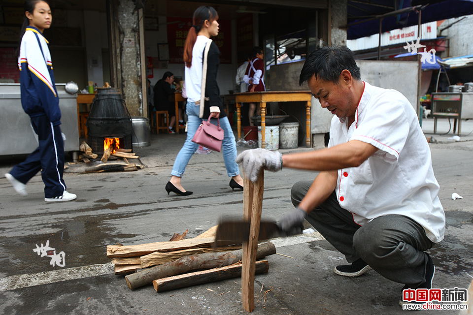 干大林在忙着劈柴,朗霞豆浆的地道之处就在于柴烧。