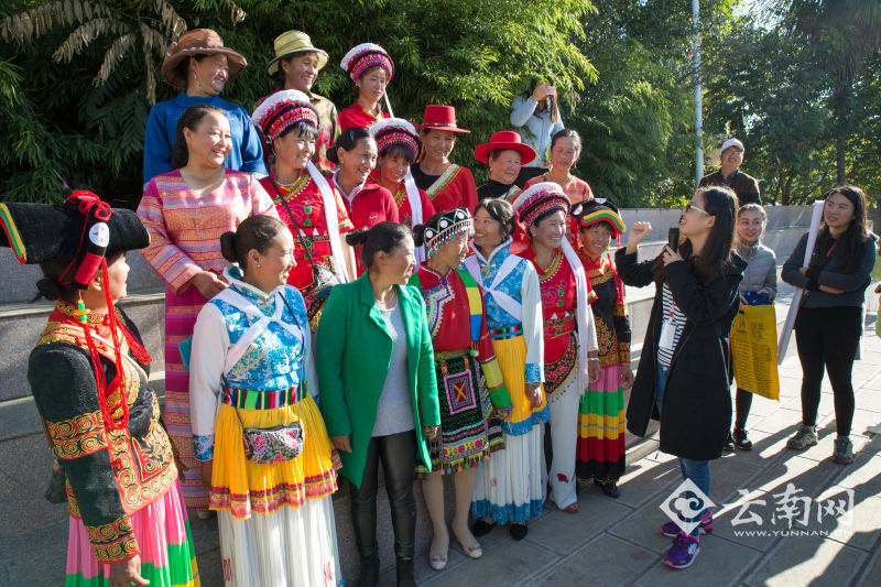 走出木瓜园,远远的就听见了欢快的少数民族音乐,循着歌声网媒记者们来到了村中的广场,几位身着不同民族服饰的妇女,正围成一圈合乐而舞。