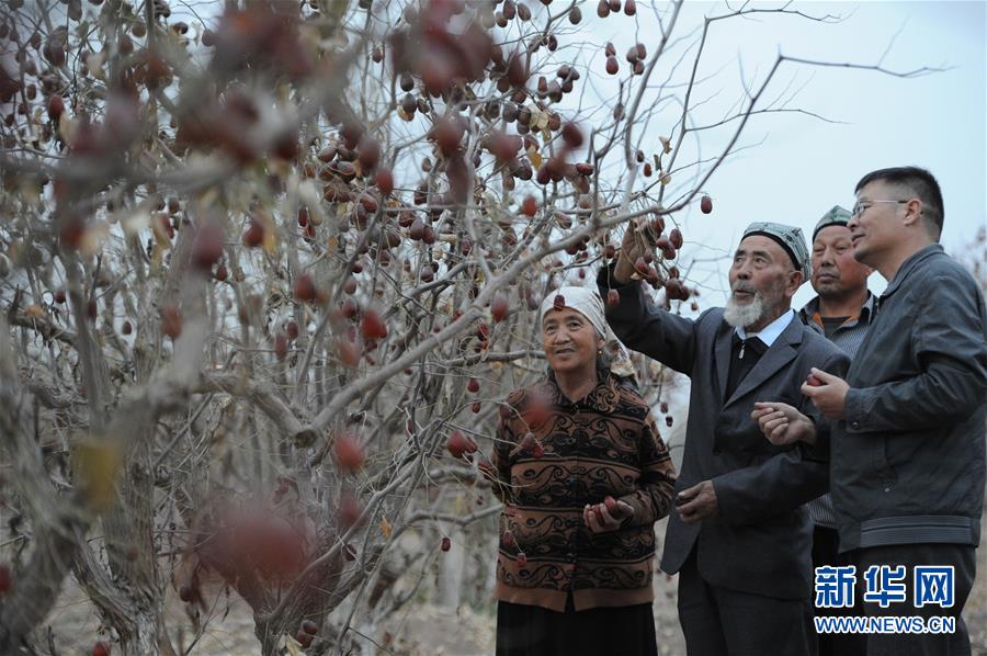 11月4日,新疆阿克苏新和县塔木托格拉克乡库英地艾日克村,75岁的创业脱贫小组组长吐逊·热伊姆(左二)与阿克苏国土资源局驻村工作人员(右一)在枣园内查看枣子挂果情况,与村民一起商讨如何通过果业种植带动村民脱贫。