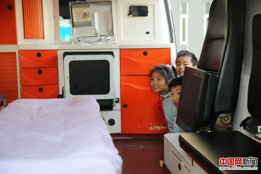 小学生们参观救护车。