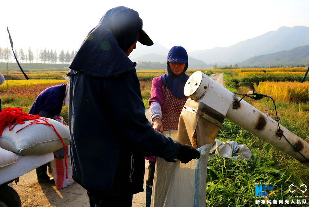 图为农民在收获水稻。新华网 陈麟 摄