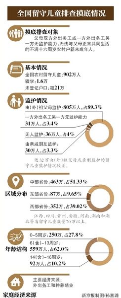 在9日召开的农村留守儿童关爱保护工作部际联席会议上,民政部副部长高晓兵透露了此次摸底排查的结果。据她介绍,此次摸底排查开始于今年3月底,排查结果显示,全国农村留守儿童902万人。