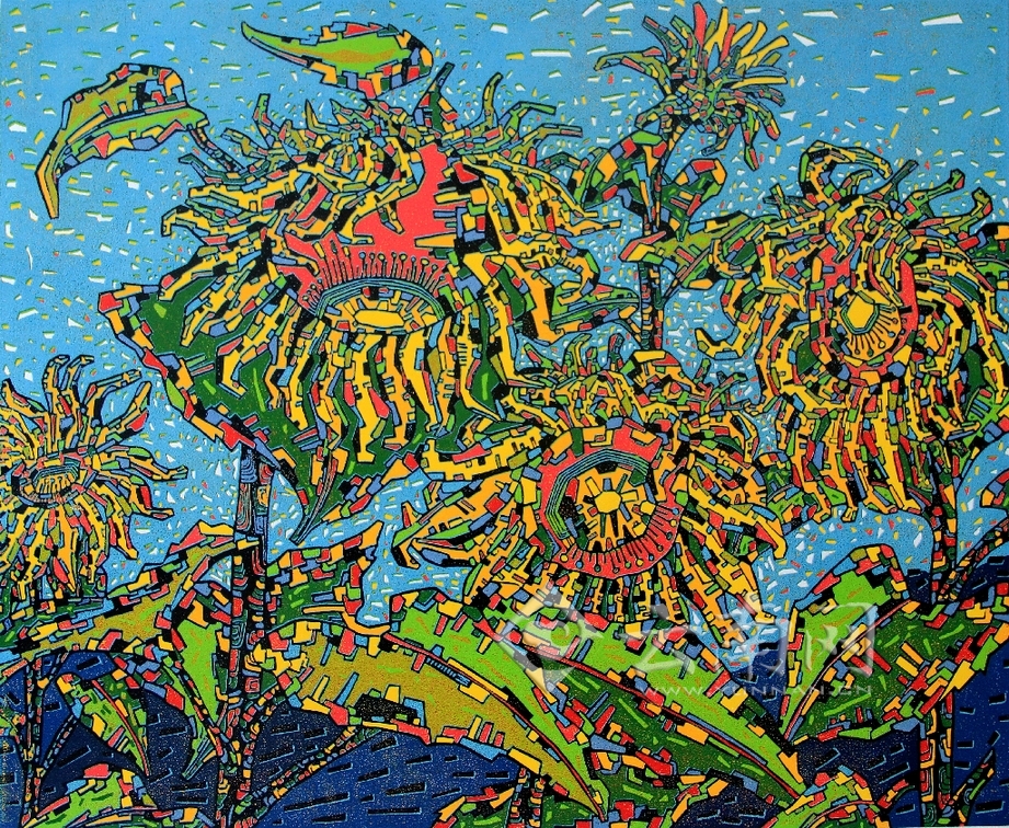 “可以叫我晓明。”他不好意的笑,有些腼腆。第一次见施晓明的作品是在微风画廊,一幅《向日葵——舞》让人眼前一亮。带着音乐般跳动节奏的色块,把印象派的浪漫情怀发挥得淋漓尽致。有人评价他是最浪漫的刻印高手。眼前的施晓明穿着一件蓝白相间的T恤,整个人显得质朴、简单。没有夸张的色调,没有前卫的造型,活脱脱一个邻家男孩的形象。他的作品风格独特,在众多画作中一眼便可认出。与外表不同,他对待艺术的态度非常严谨,在解释绘画语言时纠正了关于他的画作是几何形状拼接的说法,他说:“应该是版画语言,点线面的结合加上刀法组织,刻板上就会有不同的印迹。”