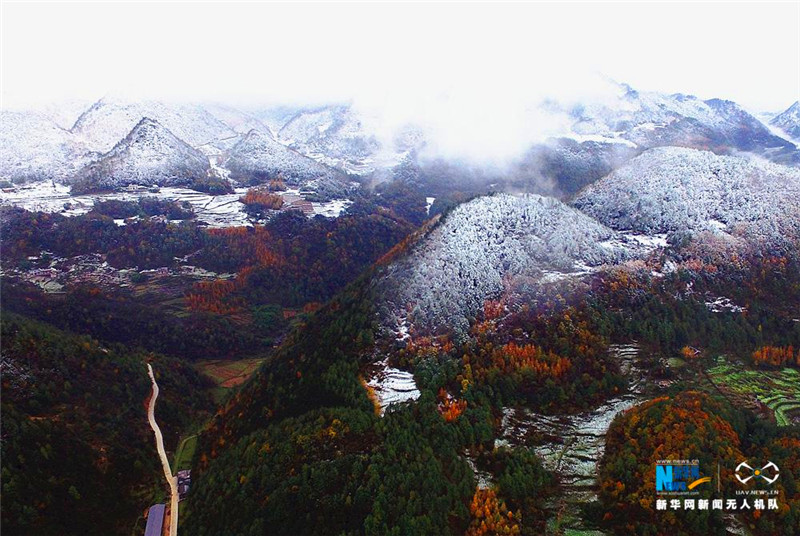 11月7日至8日,重庆红池坝迎来今年立冬之后的第一场降雪,白雪飘落在红池坝的山之巅、林之上、屋之顶、水之畔,最后齐齐落在大地之上,一幅幅江山雪景图随之而出。图为航拍重庆红池坝立冬之后的第一场雪。新华网发王强摄