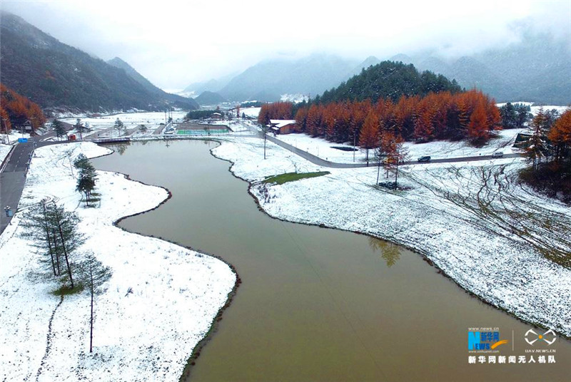 图为航拍重庆红池坝雪景,白雪落在水之畔,覆在田野上,犹如世外桃源。新华网发 王强摄