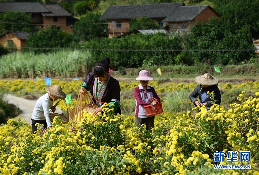 11月10日,三江县丹洲镇红路村寨塘屯村民在采摘黄金菊。