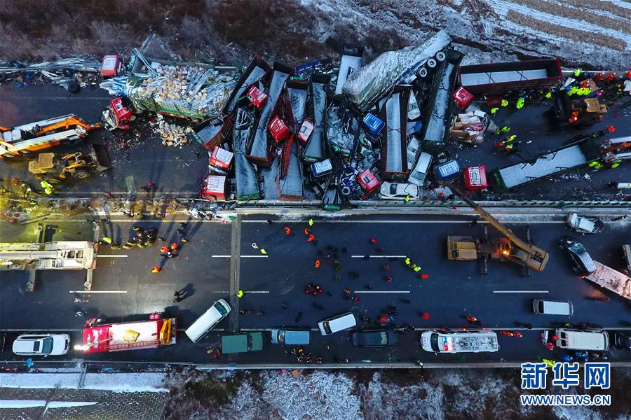 山西省公安厅交警总队11月21日消息称,当日9时左右,京昆高速平阳段太原方向65KM+500M处,37辆车发生连环相撞,造成4人当场遇难,40人受伤入院。图为航拍的事故现场。(蓝天救援队供图)