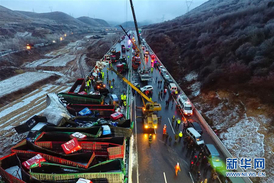 山西省公安厅交警总队11月21日消息称,当日9时左右,京昆高速平阳段太原方向65KM+500M处,37辆车发生连环相撞,造成4人当场遇难,40人受伤入院。图为航拍的事故现场。(蓝天救援队供图)