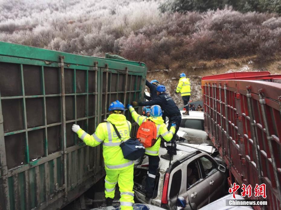 据官方通报,该起事故受雾天及道路湿滑影响。初步查明,共涉及37辆车,造成4人当场死亡、40人受伤送医院检查治疗。(蓝天救援队供图)