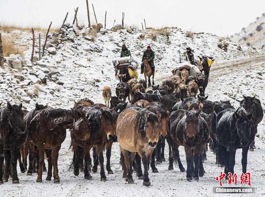 连日来,地处天山西段的昭苏大草原连续降雪,新疆伊犁昭苏县牧民忙着在大雪封山之前,将牲畜从山上转移到阿合牙孜沟冬牧场。昭苏县阿合牙孜沟是伊犁河谷中的河谷,有着昭苏高原上的“桃花源”的美誉,沟内气候宜人,冬暖夏凉,牧草丰盛,使这里成为肥美的冬季牧场,每年11月,牧民陆续将牲畜迁入此地放养,最多可以达到40万只左右。秦杰摄