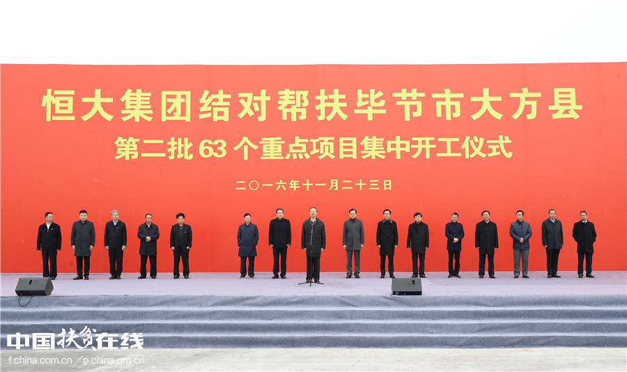 中国网/中国扶贫在线11月23日讯 (记者 何珊)11月23日,在全国政协领导下,恒大集团结对帮扶大方县第二批63个重点项目开工仪式在贵州省毕节市大方县举行,40个新农村和23个重大产业扶贫项目同时正式开工。