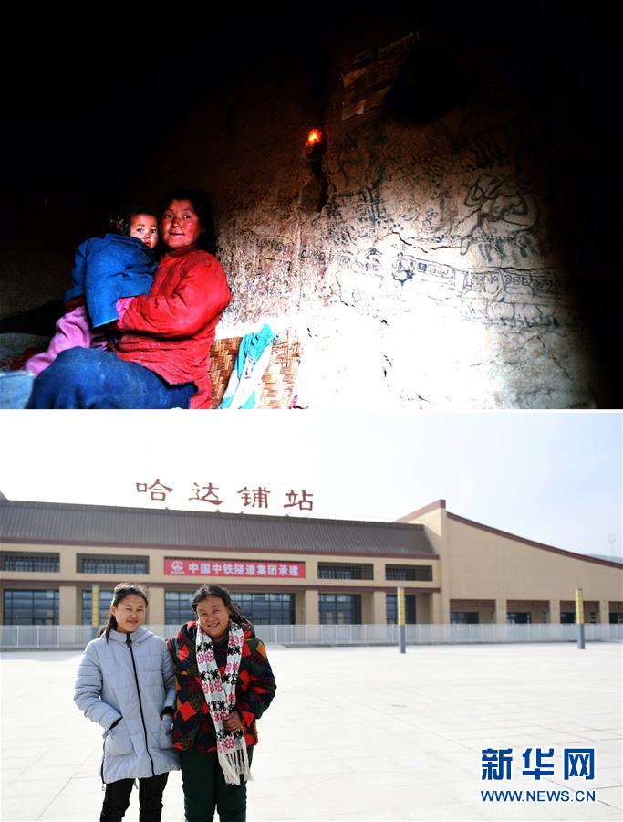 如今枢纽通途拼版照片:上图为1996年,陇南市宕昌县阿坞乡农民杨尕女抱着女儿在家中合影,身后的墙上有她们画的一列火车,当时从未坐过火车的杨尕女梦想有一天能坐着火车走出大山。新华社记者武斌摄