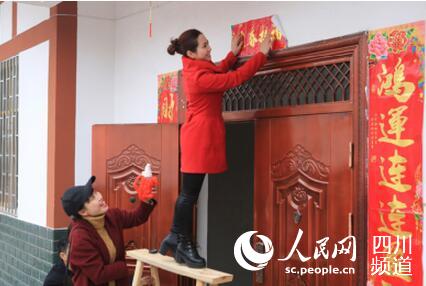 志愿者正在为搬进新居的村民贴春联。(廖小兵 摄)