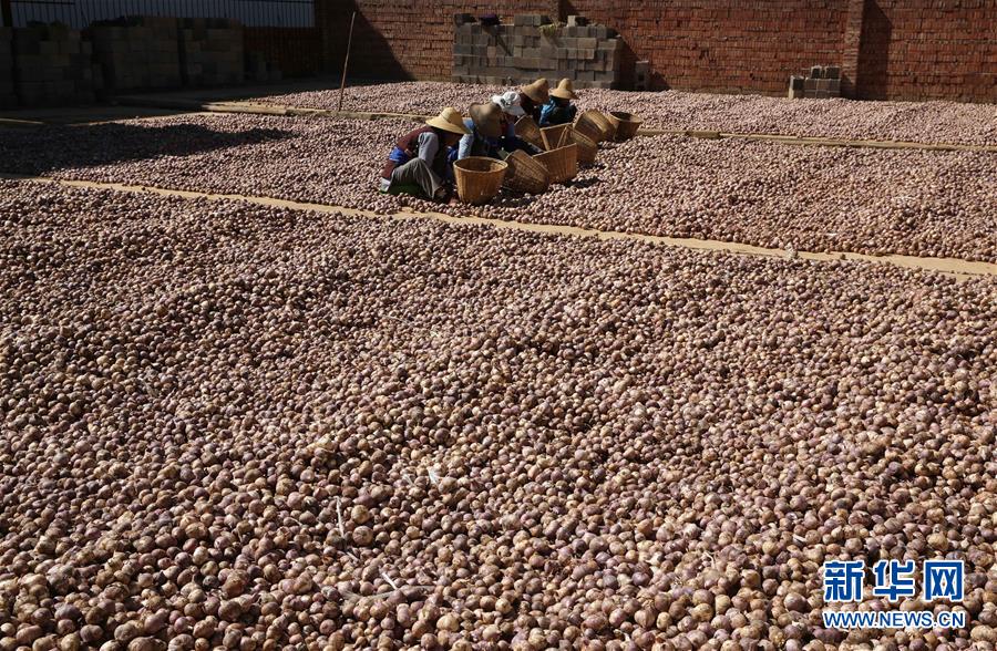 2月4日,云南洱源县右所镇农民在市场挑拣大蒜。新华社发(梁志强 摄)