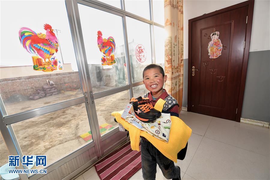 青海省互助县班彦村村民吕丹巴四郎的儿子吕增庆在新居内展示新买的衣服(1月27日摄)。新华社记者 吴刚 摄