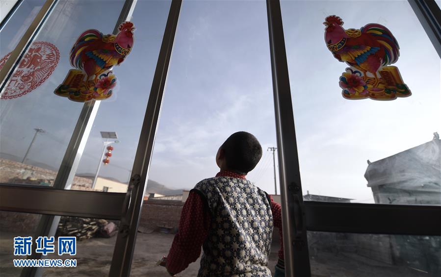 青海省互助县班彦村村民吕丹巴四郎的儿子吕增庆在新居院子内玩耍(1月27日摄)。新华社记者 吴刚 摄