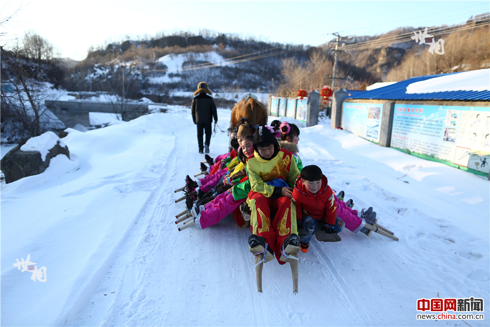 孩子们坐着牛爬犁,走在去邻村演出的路上。