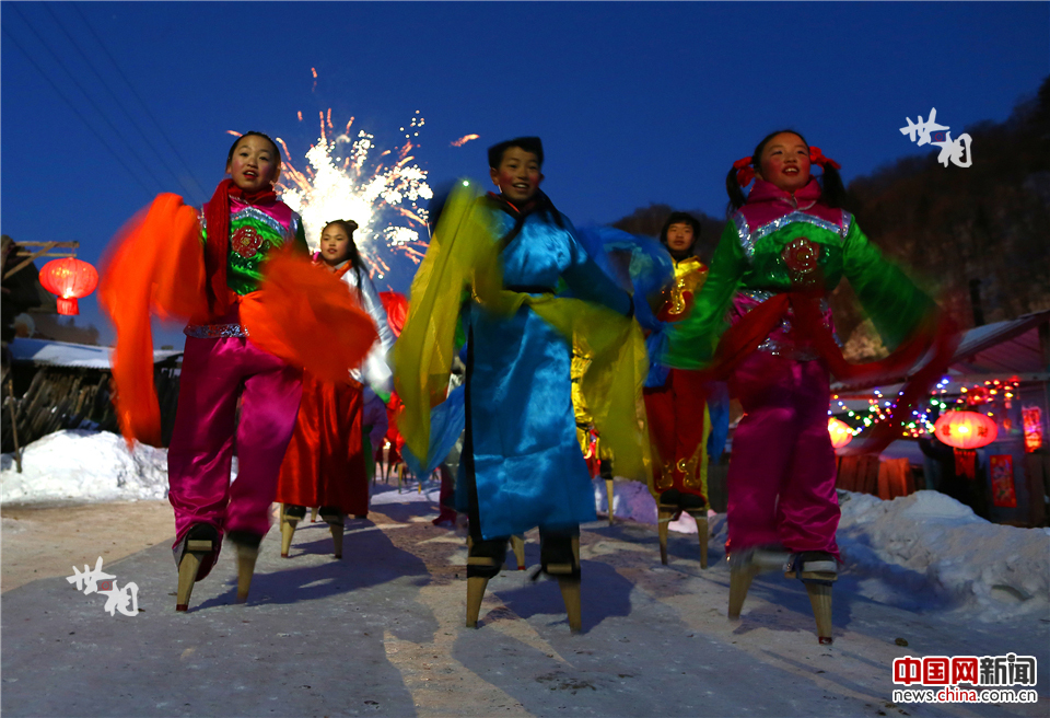 夜幕降临,娃娃高跷队的表演别有一番风味。