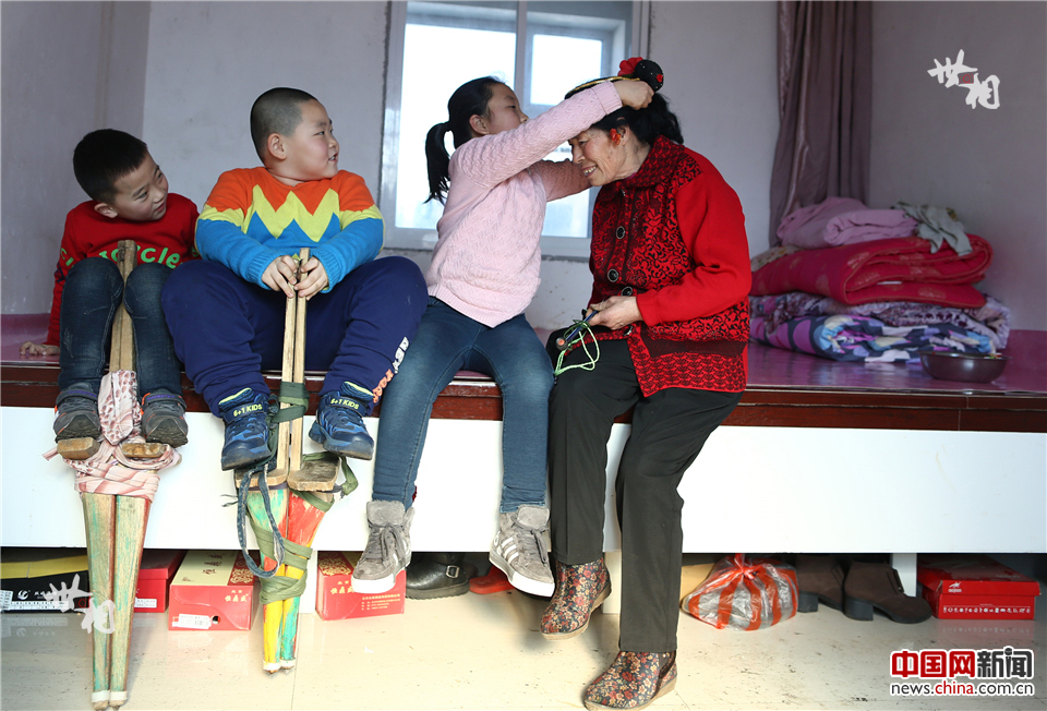 娃娃高跷队的另外一个“跷头”是10岁的薄俊宏。薄俊宏上小学五年级,在家排行老二。哥哥当兵不能回家过年,10岁的他家务活都会干。他学扭秧歌4年了,今年他第一年参加高跷队。他的父亲曾是村里高跷队的“跷头”。“父亲说,如果胆子小,不努力,你就永远踩不好高跷!”踩高跷是非常消耗体力的活儿,薄俊宏累哭过。但他说自己一定不会放弃,要继承父辈的高跷技艺,做好父亲的“接班人”。
