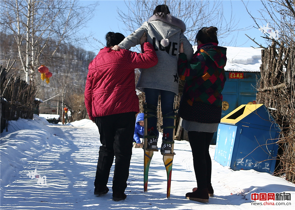 庄淑淼在奶奶和姑姑的帮助下,正在练习踩高跷。