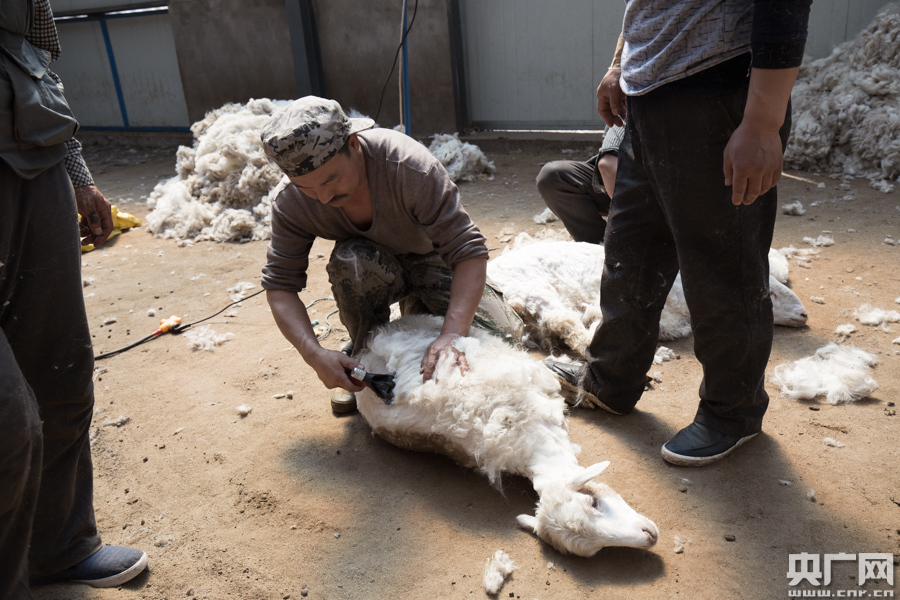 羊舍中,工人正在剪羊毛。处理之后的羊毛将运往鄂尔多斯地区生产毛衣等制品,而剪羊毛工人的日薪也达200元。合作社给农牧民提供了稳定的工作岗位,帮助他们脱贫致富。